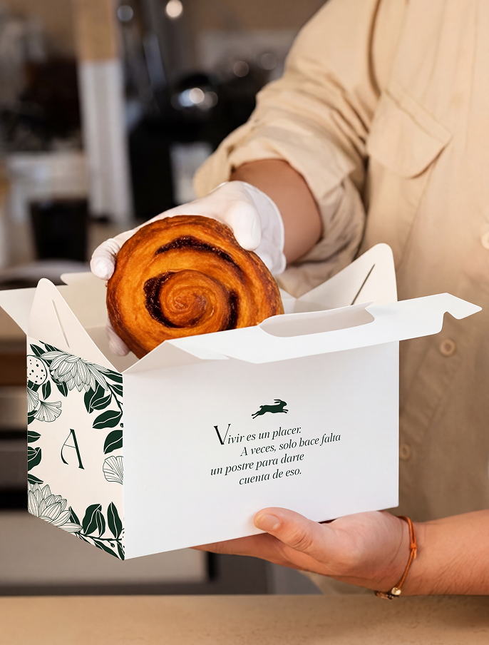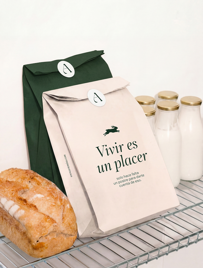 El sistema se aplicó en packaging, cajas, bolsas, manteles, diseño de vidriera y menú. Cada pieza fue diseñada para sentirse táctil y artesanal, conviviendo naturalmente con los materiales del espacio — cerámica, madera y textiles — sin perder coherencia ni presencia.