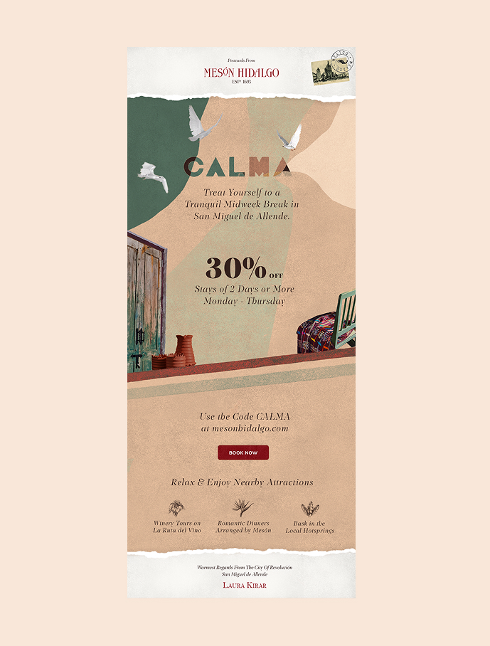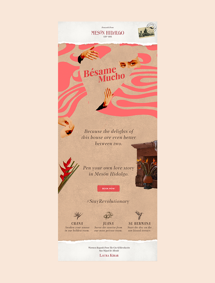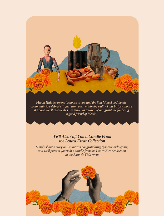 Mesón Hidalgo es un hotel boutique con alma e historia, ubicado en el corazón de Guadalajara. Durante varios años de colaboración continua, fui el responsable del diseño de sus campañas mensuales de comunicación — cada una con un concepto propio, una narrativa visual única y piezas desarrolladas para distintos canales y formatos.